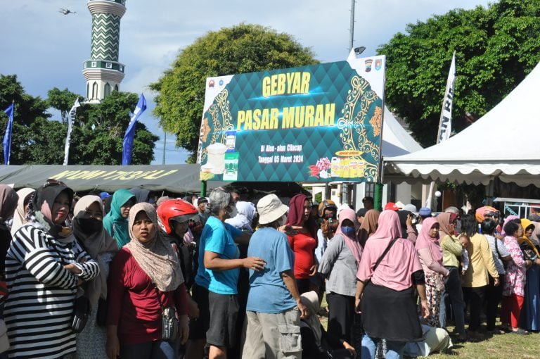 CILACAP : Gebyar pasar murah di Alun alun Cilacap, digelar Kodim 0703/Cilacap bekerjasama dengan Pemerintah Kabupaten (Pemkab) Cilacap serta stakeholder terkait mendapat serbuan dari warga Cilacap yang sudah menunggu sejak pagi sebelum dibukanya pasar murah, Selasa (5/3/2024).