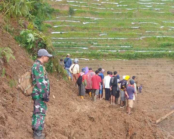 Akibat peristiwa tersebut, dua orang petani dilaporkan tertimbun material tanah dari perbukitan yang runtuh menimpa area persawahan.
