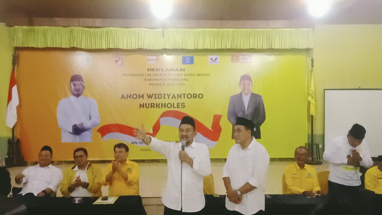 CMI Jateng| Pemalang – Partai Golkar, bersama sejumlah partai non-parlemen seperti PSI, Hanura, Gelora, Perindo, dan Partai Buruh, resmi mendeklarasikan pasangan Anom Widiyantoro dan Nurkholes (AN-Nur) sebagai calon Bupati dan Wakil Bupati Kabupaten Pemalang untuk Pilkada 2024-2029.