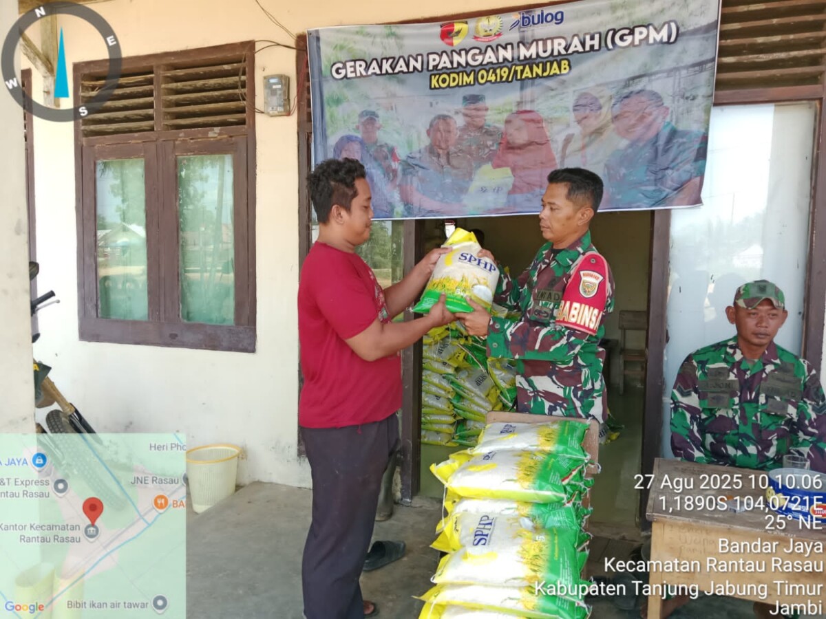 Bandar Jaya,CMInews.co.id-Gerakan Pangan Murah ( GPM ) yang gencar dilaksanakan pemerintah di tindaklanjuti dan dilaksnakan oleh Koramil 0419/06 Rantau Rasau. Kegiatan yang berlangsung di sekitar Mako Koramil di Kelurahan Bandar Jaya, Rabu 25/08/2025 tersebut menyedot perhatian dan di serbu warga.