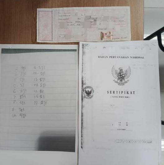 Petugas dalam pengungkapan ini mengamankan sejumlah barang bukti, antara lain kwitansi pembayaran Rp.50 juta, catatan rincian pembayaran Rp.57 juta, serta fotocopy sertifikat tanah yang digunakan pelaku untuk meyakinkan korban.