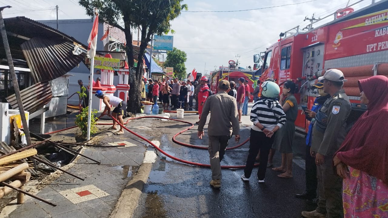 Jago merah melahap habis bangunan warung sembako, warung mie ayam dan sebuah sepeda motor tak luput dari kebakaran.
