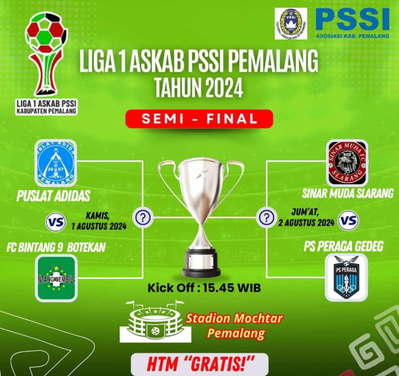 Pemalang, CMI News – Stadion Mochtar Sirandu, Pemalang akan menjadi saksi bisu dari pertarungan sengit antara Sinar Muda FC dan PS Peraga Gedeg dalam laga di semi final Liga 1 Askab PSSI Pemalang.